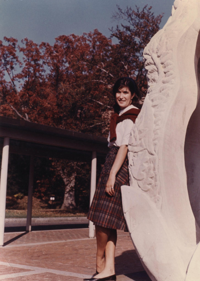 Figure 2: Judy Hallett in front of the Persephone statue at Katharine Lee Bates Hall, Wellesley College, 1964. Image used by permission of Dr. Hallett.
