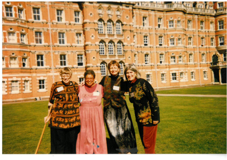 Figure 4: The British Classical Association meeting, Royal Holloway College, April 1997. From left: Barbara McManus, Shelley Haley, Barbara Gold, and Judy Hallett. Image used by permission of Dr. Hallett.