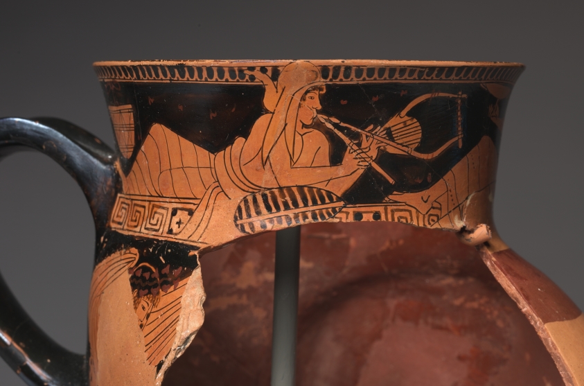 Take, for example, this image on a fifth-century rhyton (a type of drinking vessel) from Athens. Scholars of ancient art have struggled to understand the foreign-looking cap on the musician, but there isn’t even agreement about the basic level on which the cap is to be understood. Is it an actual piece of costume worn at symposia in fifth-century Athens? Is it a metaphor for a particular type of behavior – the visual equivalent of the statement that someone is drinking “like a Scythian”? Or is it an imaginary piece of costume associated with long ago or faraway places? Each of these suggestions has its proponents, and each has its merits.