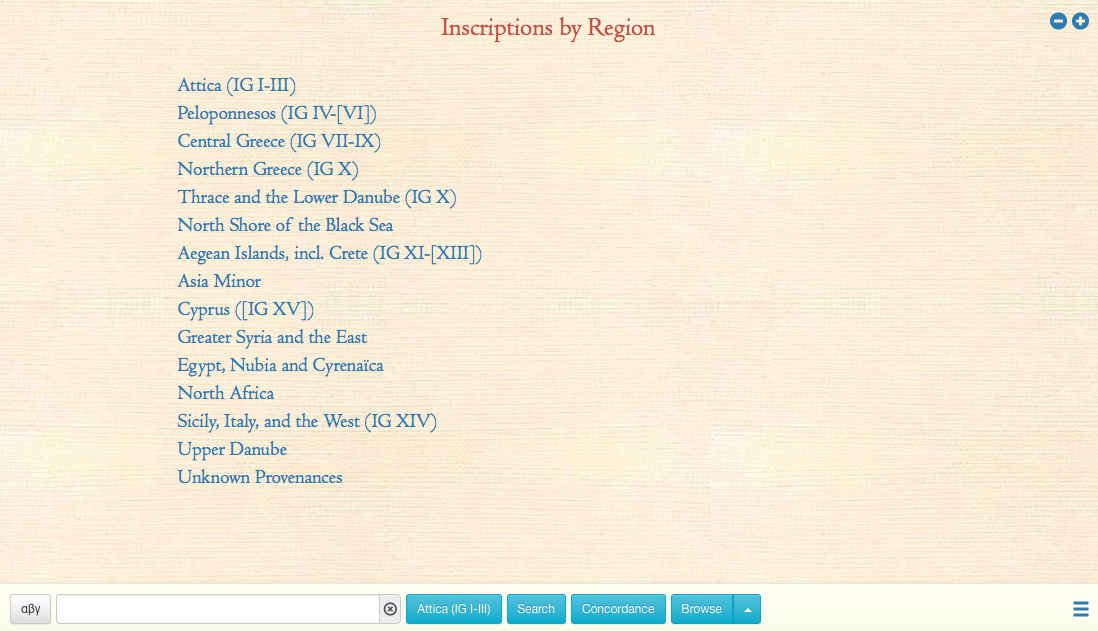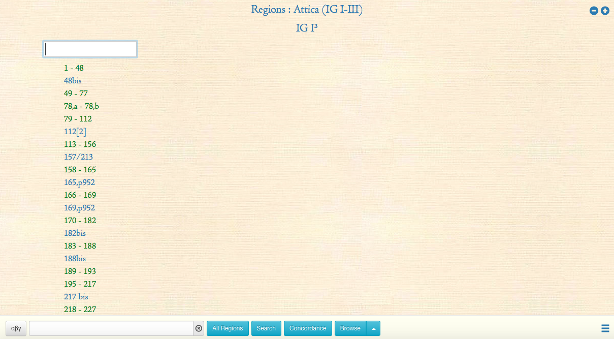 To find a specific text or group of texts, you can browse by region or by bibliographic reference. Individual records are organized by (sub-)region, publication, and inscription number, with the result that browsing by region requires quite a few clicks before you can view any text. Several pages display the lists of the texts’ numbers out of order, which can be confusing when trying to determine what is and isn’t included.