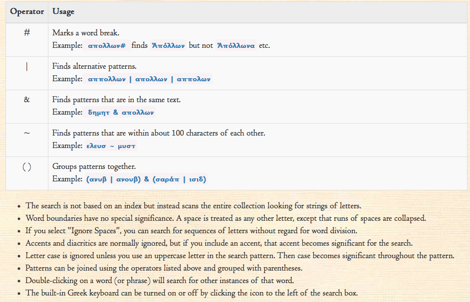 What makes PHI more than just another corpus is that it is searchable. Every string of Greek text is hot: simply double click to get search results. The site searches character strings, rather than indexed words, which is especially useful in the realm of fragmentary Greek inscriptions. Searches can cover the entire corpus, a region, or sometimes a single archaeological site. Search results present the text(s), the number of times the search item appears, and statistics by percentages. PHI—Searchable Greek Inscriptions may be simple in design, but it remains a mighty reference and search tool.