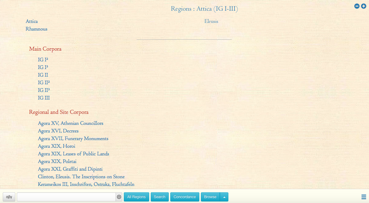 The site’s main page presents a list of the regions in which the inscriptions were discovered, generally following the order of coverage in IG. The texts themselves are quite up-to-date: references to Supplementum Epigraphicum Graecum (SEG) end at volume 58, published in 2012, and covering publications through 2008. Depending on the user’s purpose, PHI may not be a sufficient replacement for examining the text in print, since the versions of texts available on the site are not always identical to the hard copy, and there is no guide to indicate what changes should be expected. The differences are most obvious for old volumes of IG that featured alternative epigraphic notations that could be confusing today; the PHI project has updated those texts to the editorial style used throughout their whole site, namely, the Leiden Conventions. In addition, there are occasional issues with the appearance of complicated accent-letter combinations, such as the eta with a circumflex used in the Old Attic alphabet, which are consistent across operating systems and browsers. One should err on the side of caution and treat a PHI text as a unique publication, citing it by the PH reference number.