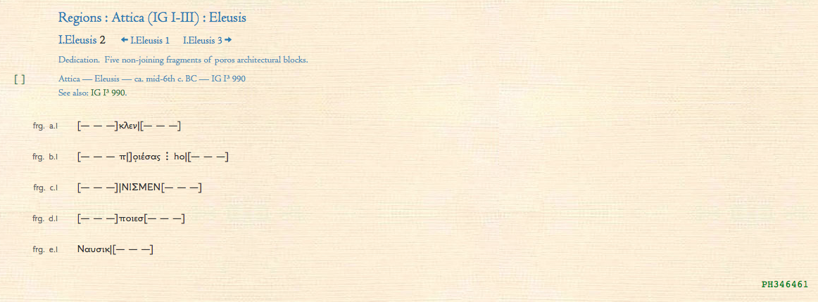 The Packard Humanities Institute’s Searchable Greek Inscriptions revolutionized the accessibility of ancient Greek epigraphic texts, first in CD-ROM format and then online since 2005. David Packard, Jr. initiated the project in the late 1980s as a collaboration between teams of scholars at Cornell University and The Ohio State University, and supported it financially through the Packard Humanities Institute (PHI). The original intent was to produce searchable texts of the well-over 200,000 inscriptions published in volumes like Inscriptiones Graecae (IG). The PHI editors did not aim to replace or fully re-edit the published editions of the texts, but did make corrections and standardize many inconsistencies. (On the early years of the project and its working methods, see Iversen 2007).