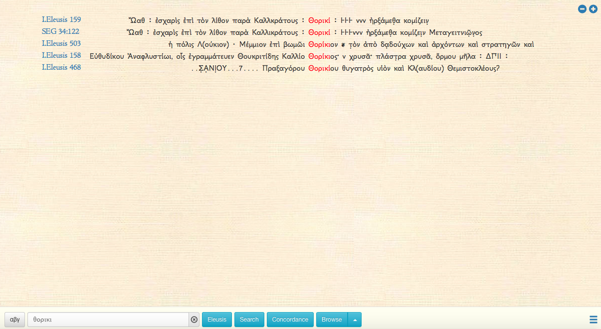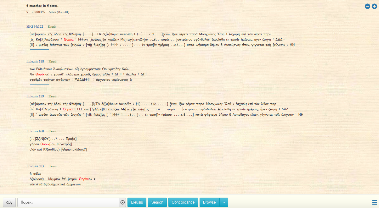 When drawing conclusions from the search results, it is important to recall that they include words or letters that may be in square brackets or dotted (i.e., read with less than 100% certainty). Occasionally the same inscription appears more than once. For example, I.Eleusis 159 and SEG 34:122 are different editions of the same text, but can appear individually in the number of hits: a search of θορικι in Eleusis brings up “5 matches in 5 texts,” but there are really four matches in four texts. This kind of overlap is fairly rare, however, because PHI tends to use the most recent version of a text (e.g., the only IG I2 texts that appear on the site are those excluded from the updated IG I33). The statistics cannot be used uncritically, but they are a very useful tool to get a broad picture, especially for comparisons.