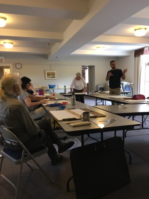 Figure 1: Anthony Baus and participants during the workshop in classical perspective on August 10. Photo by Susan Bachelder.