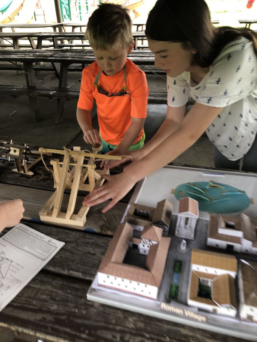 While Baus’ lecture and workshop encouraged adults in the Berkshires to see and draw as the ancients did, in the Ohio Valley, the Franciscan University of Steubenville’s Department of Classics invited children to walk in the sandals of Roman engineers in their “Ancients in the Parks” series. Sarah Wear led this program, which ran in June and July at parks in Weirton, WV, Follansbee, WV, Toronto, OH, and Steubenville, OH. Through the use of models, toys, and coloring pages, children learned about aqueducts, pontoon bridges, arches, domes, and catapults.