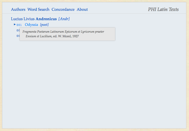PHI includes the ancient sources for each author’s individual fragments, a practice not always followed by its competitors. For example, PHI uses Morel’s Fragmenta Poetarum Latinorum Epicorum et Lyricorum for the text of Livius Andronicus, and thus the opening line of Livius’ Odyssia (virum mihi, Camena, insece versutum) is properly attributed to Gellius’ Noctes Atticae 18.9.5. The Latin Library, on the other hand, offers only the Homeric reference for the line (Od. 1.1), even though its source for the text (Warmington’s Remains of Old Latin, vol. 2), lists Gellius as the ancient attestation. As a result, PHI better conveys the indirect transmission of the text.