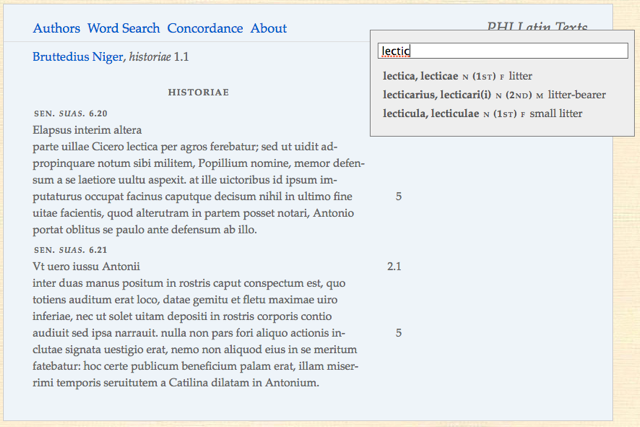 While viewing a text, PHI’s vocabulary tool allows for searching by lemma. Users access the tool by clicking on the “PHI Latin Texts” logo in the upper right hand corner while on the text page. Rather than requiring users to know the precise lemma for a given word, the tool supplies results as the user is typing . While useful, this method is neither as convenient nor as expeditious as Perseus’ clickable texts, and it provides no links to fuller entries in online dictionaries, such as Lewis & Short.