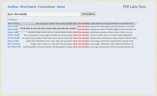 The third tool on PHI is a “Concordance,” which is similar to “Word Search,” except results are presented in a table that is sortable either by the words preceding a match (by clicking on the left of the table), or by the words following a match (by clicking on the right of the table) . Logical operators can be used, but they are less effective since each term in a given pattern appears on its own line. Hence, the search for “#dura ~ #puella” yields double the results as the global search above because every instance of each term receives its own entry. The primary appeal of the Concordance, it seems, is aesthetic.
