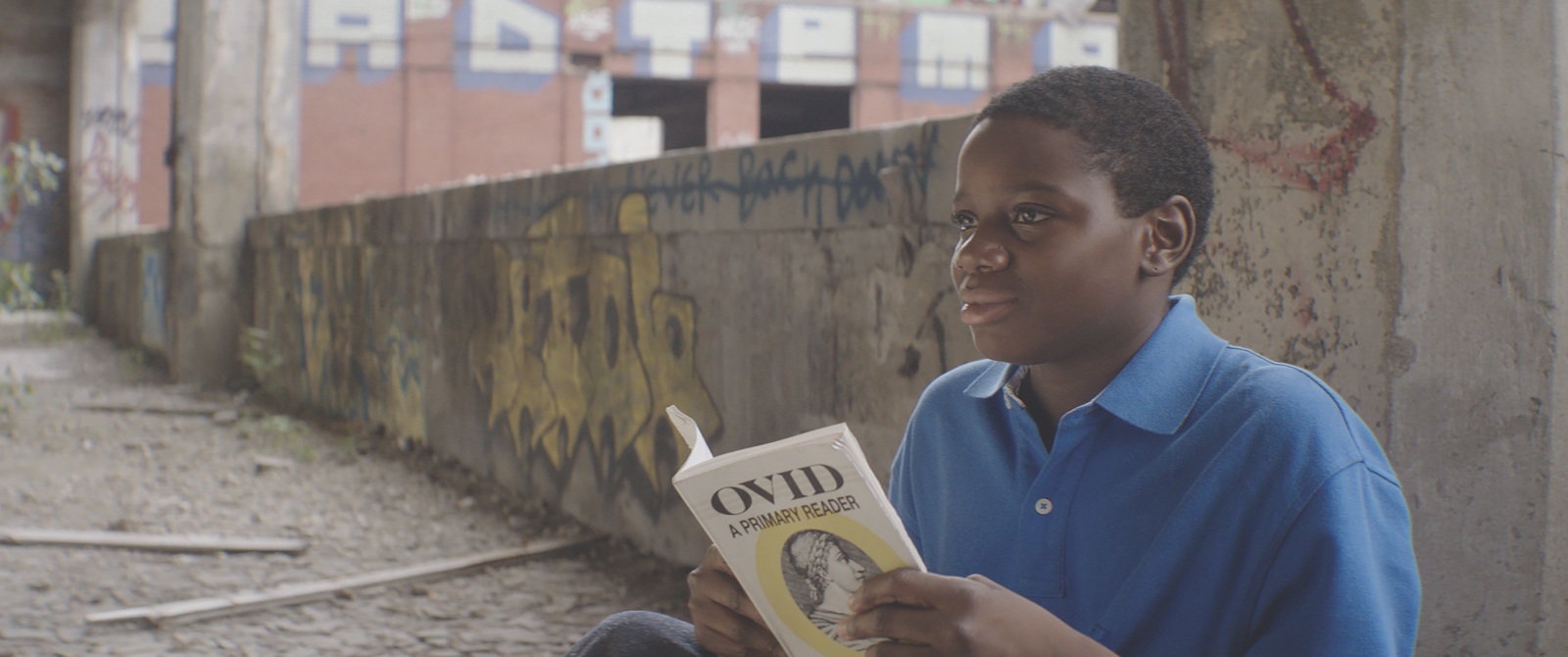 Figure 3: DaJuan Cook Jr. as the teenager Jamal reading Ovid and imagining Ovid's world coming to life around him. Scene from Ovid and the Art of Love.