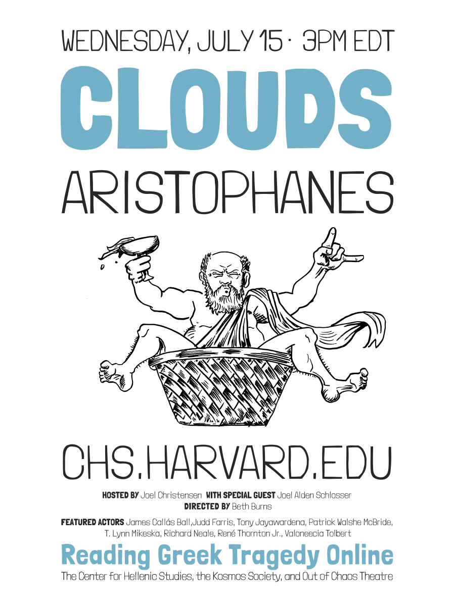 Figure 5: Poster featuring an image by John Koelle for the Reading Greek Tragedy Online performance of Aristophanes’ Clouds on July 15. Poster design by Allie Mabry.