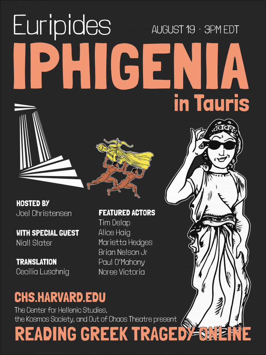 Figure 6: Poster featuring images by John Koelle for the Reading Greek Tragedy Online performance of Euripides’ Iphigenia in Tauris on August 19. Poster design by Allie Mabry.