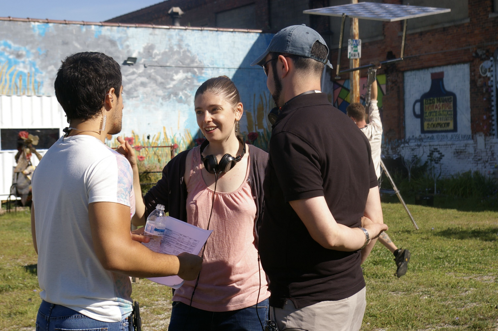 Figure 1: Michael Angelo Zervos (producer), Esmé von Hoffman (writer-director), and Benjamin Weisman (producer) on set at Art Park in Detroit during the movie’s filming. Photo by Glenna Lang.
