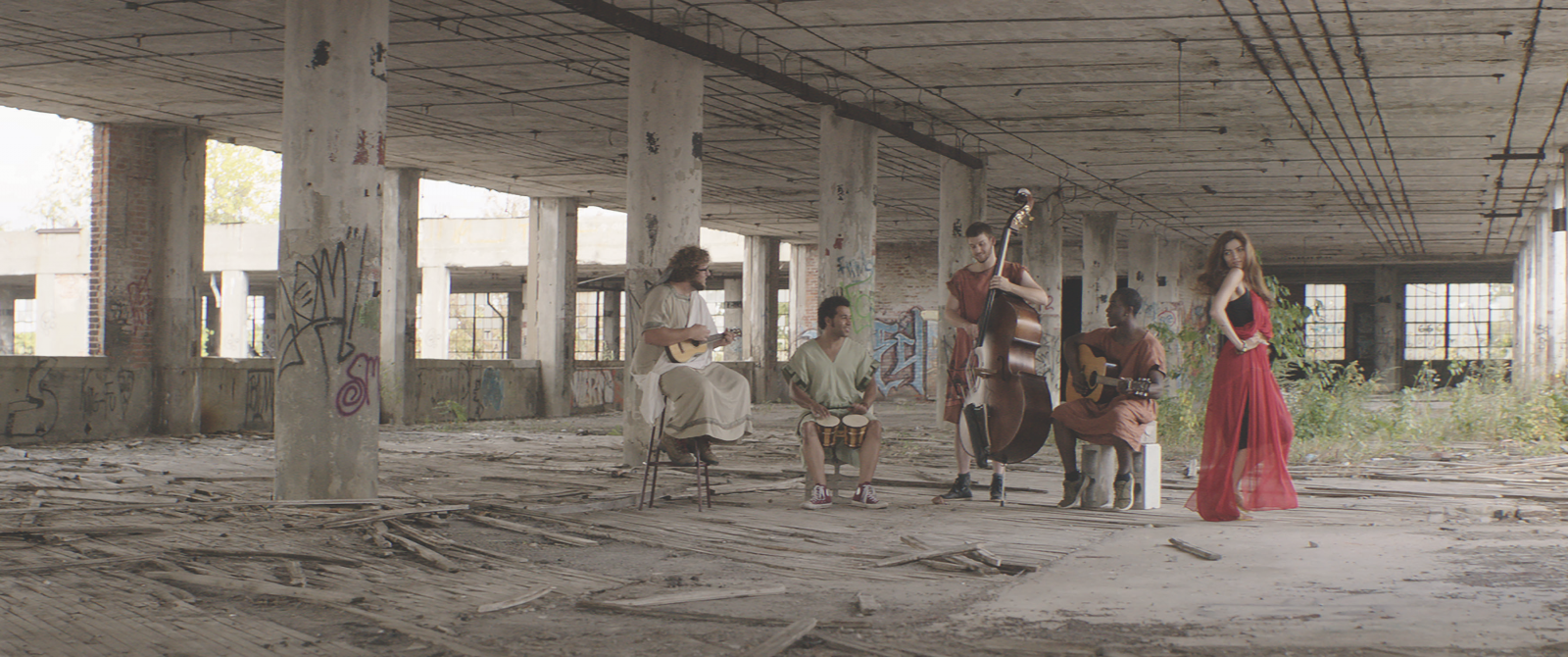 Figure 2: Corbin Bleu as Ovid performs with fellow musicians. Scene from Ovid and the Art of Love filmed at Detroit's Packard Plant.