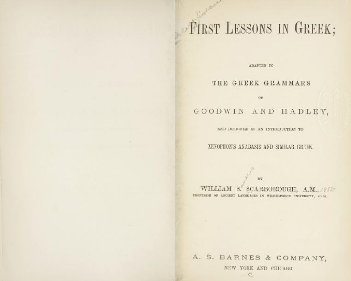 Williams Sanders Scarborough, an 1875 graduate of Oberlin College, was a pioneering African American scholar who wrote a university-level Greek textbook. Kirk Ormand, who now teaches at Oberlin, interviewed Prof. Michele Ronnick, who has recently published a facsimile edition of Scarborough’s Greek textbook, First Lessons in Greek (1881), with Bolchazy-Carducci press. Prof. Ronnick is the world’s leading expert on Scarborough. She found, edited, and published Scarborough’s autobiography in 2005, and has researched Scarborough’s time at Oberlin and as President of Wilberforce University.[1]