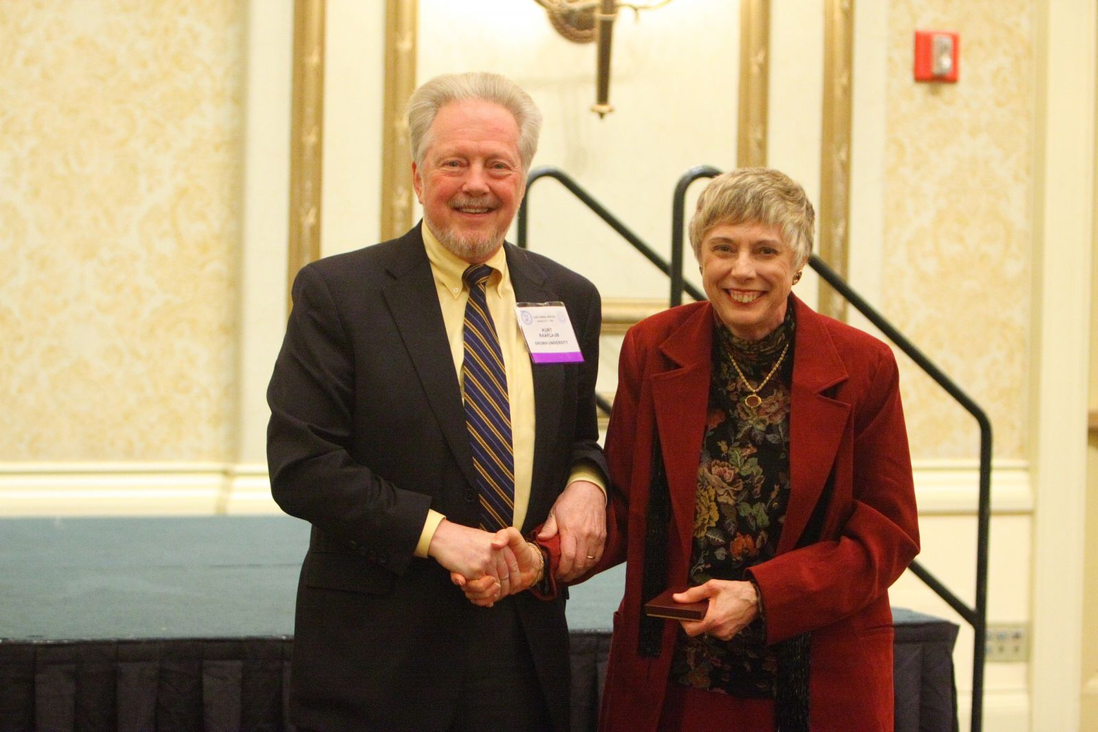 While I hope to publish a more detailed memorial notice in the future, I want to express my immediate regret that the Society has lost a member who served it so long and so well. Professor McManus was a member and chair of multiple committees. She was elected an at large member of the Board of Directors (1994-1997) and Vice President for Professional Matters (2001-2005). As Vice President she led the effort to create our census of classics department staffing and enrollments, personally updated our list of departments where classics is taught, and persuaded those departments to respond to the first iteration of that census (covering the 2003-2004 academic year). About 60% of the departments on our list ultimately did complete the census, and in subsequent years the Society was not able to achieve that level of participation until the most recent iteration when we hired the University of Chicago’s Survey Lab to carry out this project. For all of this effort Professor McManus received our Distinguished Service Award in 2009, and the picture below shows her receiving that award from Kurt Raaflaub, then President of the Society, at the annual meeting in that year.